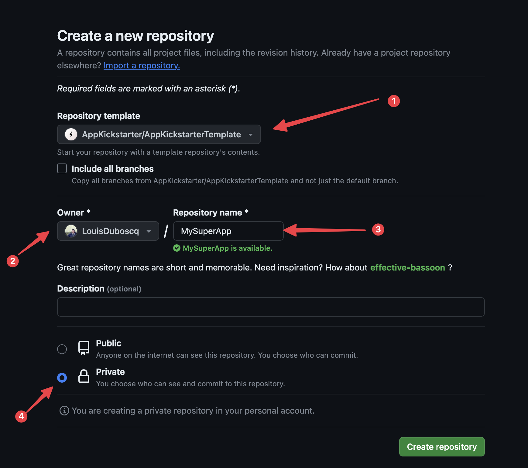 * In “Repository template” choose “AppKickstarter/AppKickstarterTemplate.”